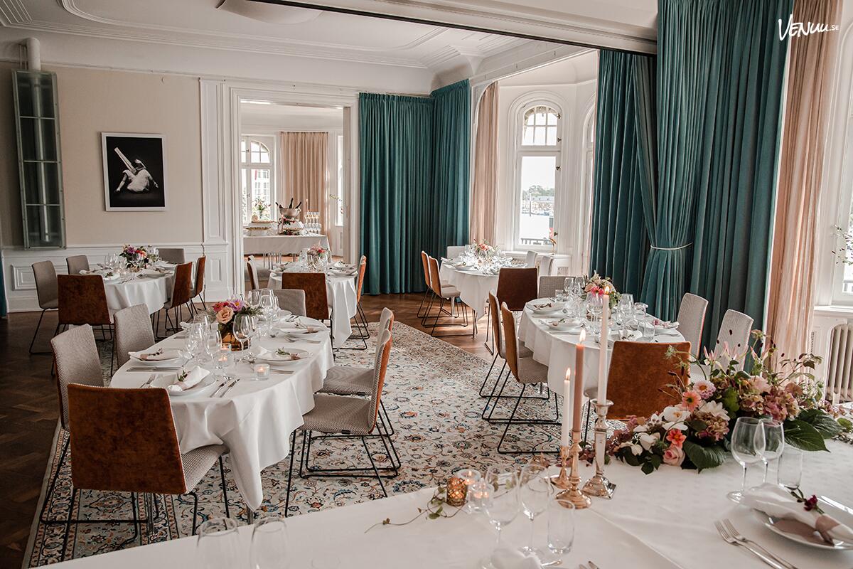 Vår största salong på tredje våningen som ligger längs med Strandvägen. Ljus och exklusiv salong med två burspråk, franska balkonger, öppna spisar och enastående utsikt över Nybrovikens vatten.