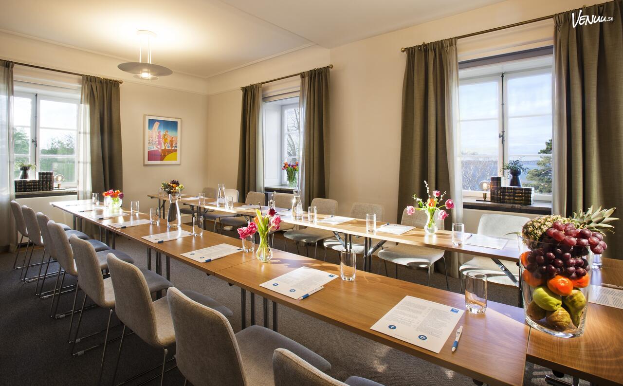 Här sitter ni bekvämt i en ljus lokal med fönster som vetter mot den lummiga grönskan och vattnet utanför. Inredningen kombinerar funktion med Mästarvillans tidlösa karaktär, vilket skapar en atmosfär som är både avslappnad och professionell. Tekniken är framtagen för att möta dagens krav, men är diskret integrerad för att inte störa den historiska inramningen.