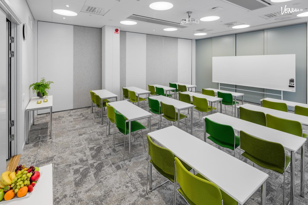 Lokalen är utrustad med modern mötesteknik som gör det enkelt att hålla presentationer, hybridmöten och digitala konferenser. Den flexibla möbleringen gör det möjligt att arrangera allt från föreläsningar och seminarier till mer interaktiva möten med grupparbeten och workshops.