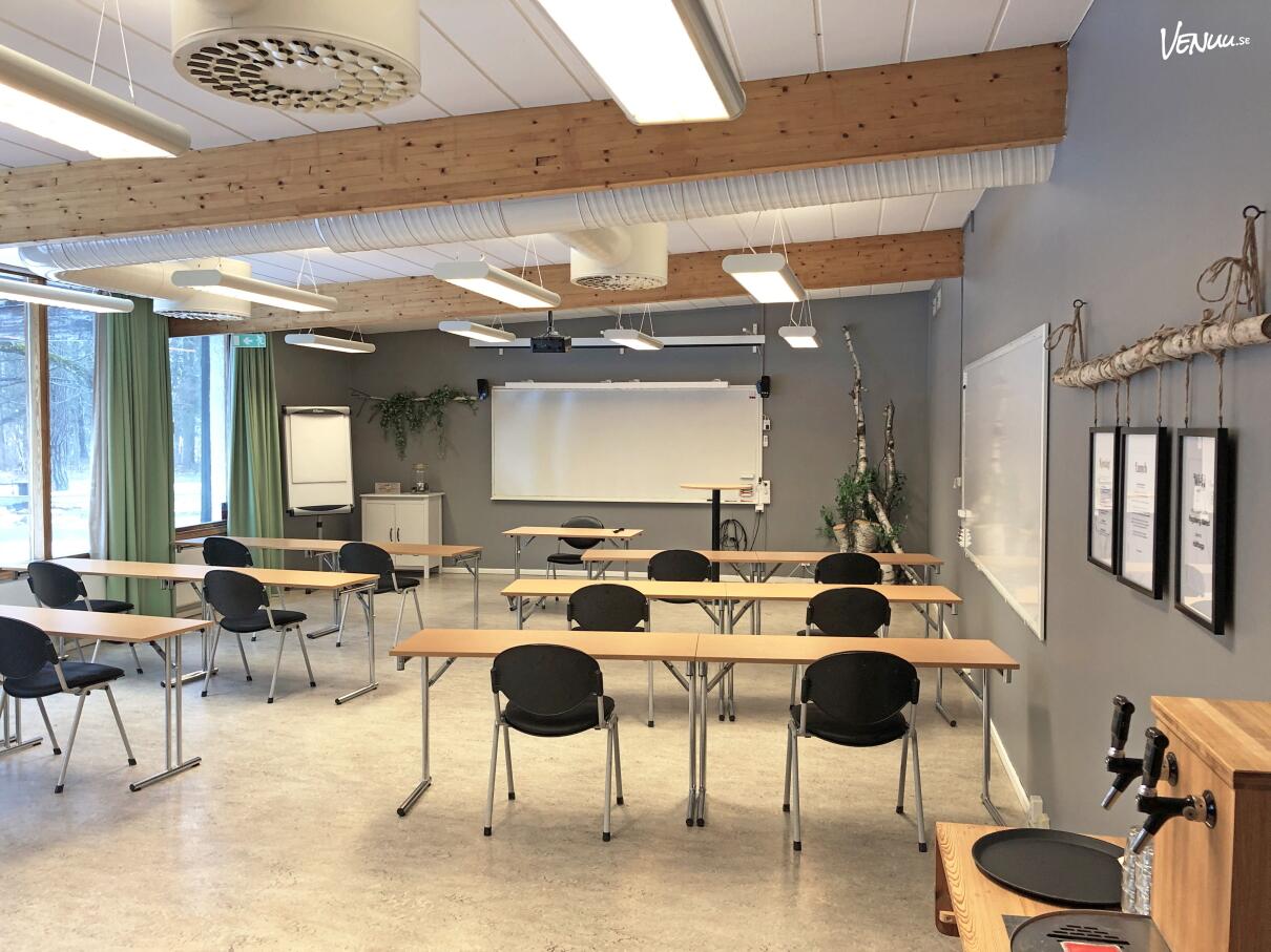 Parksalen lever sannerligen upp till sitt namn. Genom ett generöst fönsterparti som sträcker sig längs hela långsidan har ni en rofylld vy direkt ut mot den vackra parken. Det är en miljö som bjuder in till både kreativitet och arbetsro, oavsett om ni planerar en föreläsning, en workshop eller ett stående mingel för 50 gäster.
