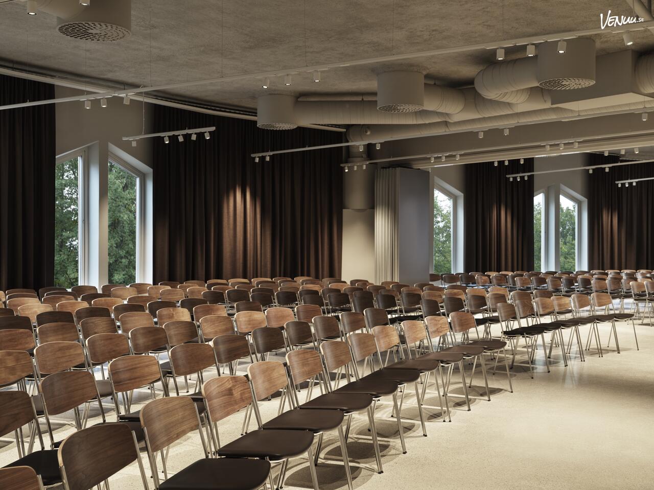 Hagasalen är vår största och mest flexibla lokal, där generösa fönsterpartier ger ett naturligt ljusinsläpp som främjar både kreativitet och produktivitet. Salen är unikt utformad med breda dörrpartier som gör det möjligt att köra in fordon eller skrymmande utställningsmaterial direkt i lokalen. För maximal anpassning kan salen delas av med en ljudisolerad vägg, vilket skapar två separata rum – perfekt för grupparbeten, parallella sessioner eller utställningsytor. Här möts inspirerande arkitektur och den allra senaste AV-tekniken för att säkerställa en sömlös upplevelse för både fysiska och hybrida möten.