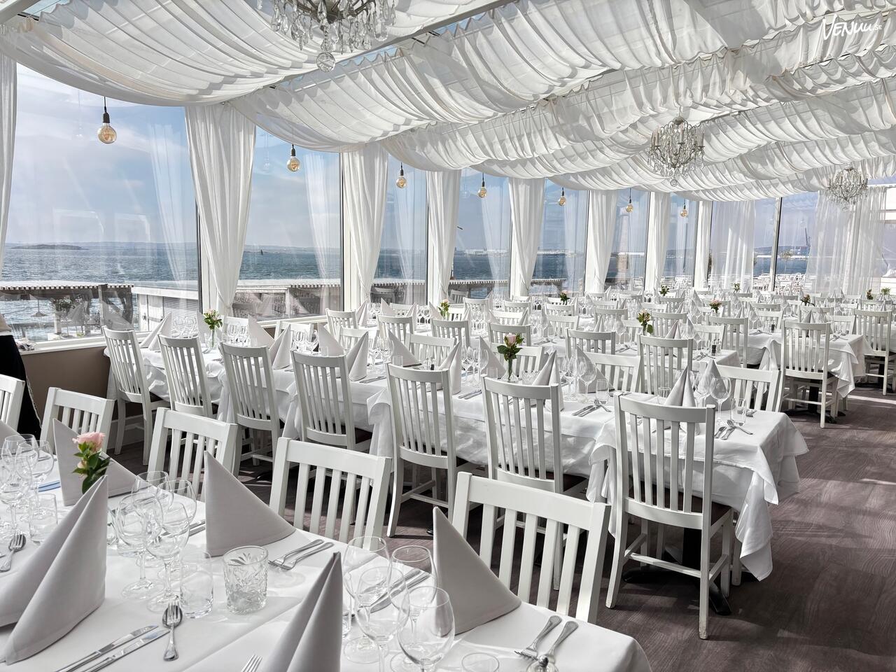 Glasverandan rymmer upp till 80 sittande gäster och är en inglasad del av vår restaurang med fantastisk havsutsikt. Glasverandan kan enbart abonneras då man bokar en 3-rätters meny för sällskapet. Meny pris 995 kr/person.