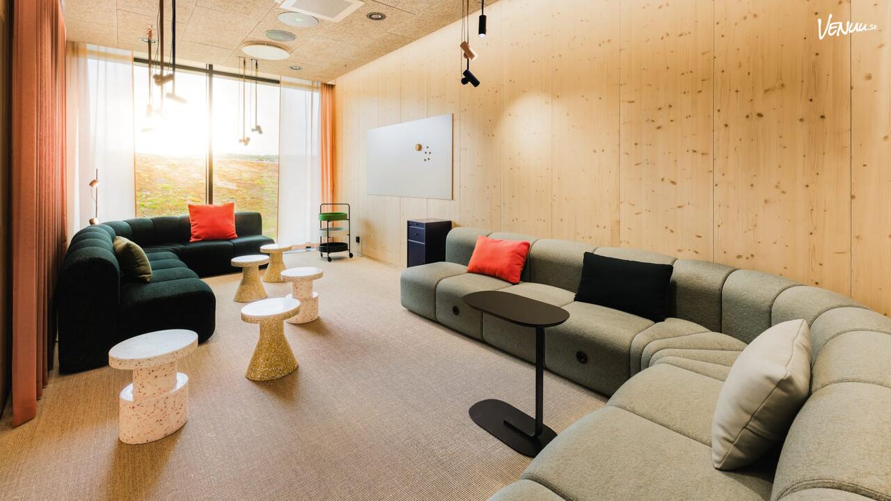 Lokalen rymmer upp till 12 personer och är utrustad med LED-skärm, whiteboard, wifi, högtalare och soffmöbler som kan anpassas efter behov. Pallarna i återvunnen plast ger fler sittmöjligheter och borden är höj- och sänkbara, vilket gör rummet både flexibelt och dynamiskt.