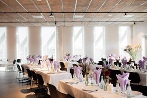 En stor och flexibel festlokal med elegant inredning, perfekt för bröllop och stora fester.