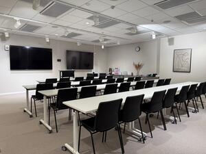Modern and professional conference room for up to 120 people equipped with a projector, audio system, whiteboard and wifi.