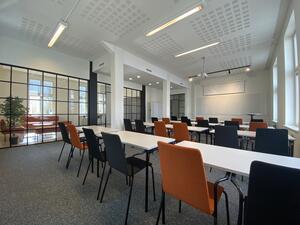 Flexibelt och modernt konferensrum med justerbar gradäng för upp till 116 personer.