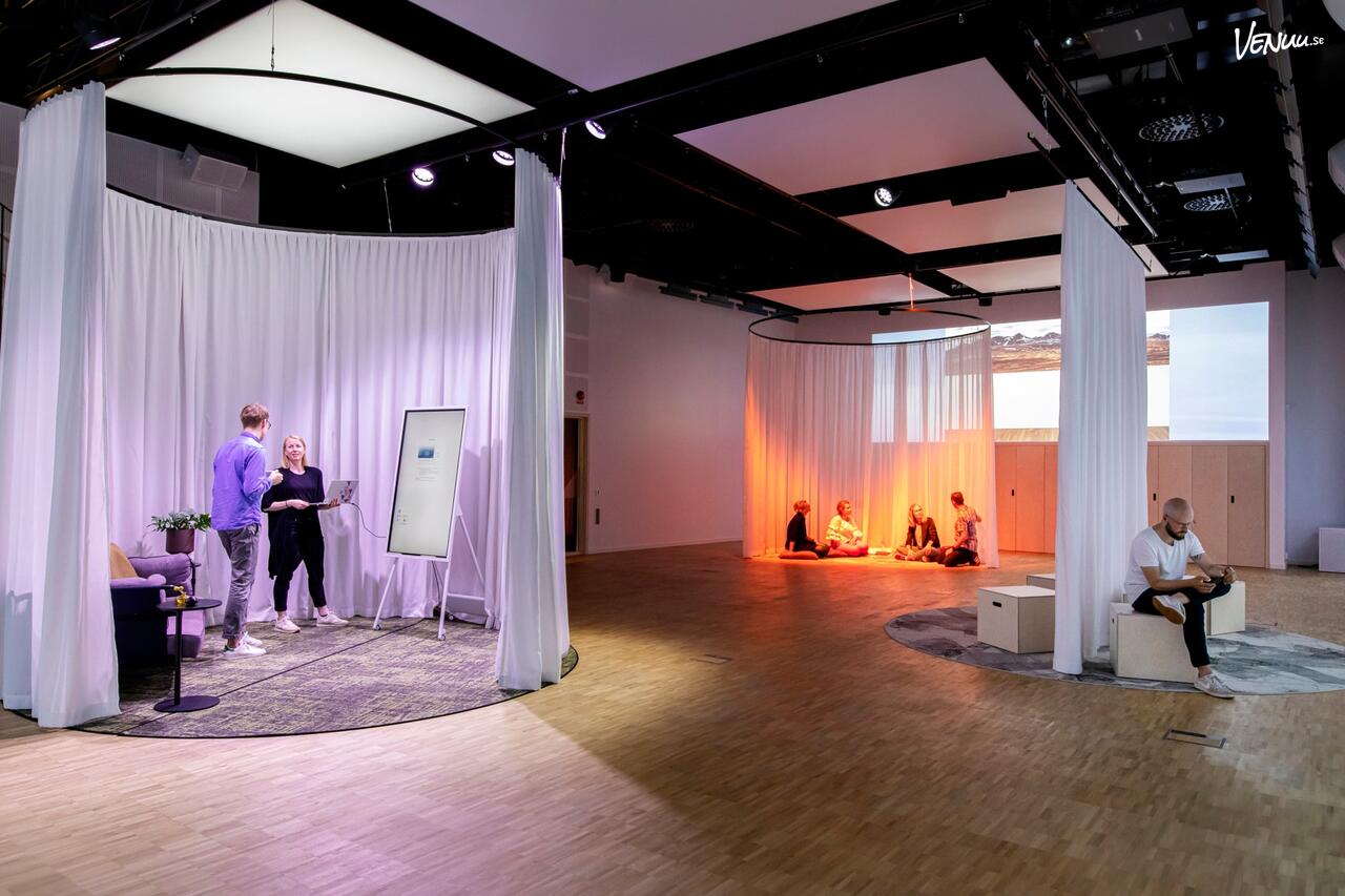 Här finns modern teknik med flera projektorer samt ljud- och ljusanläggning som stödjer allt från föreläsningar till panelsamtal och presentationer. Möbleringen är flexibel och kan anpassas med stolar, bord, soffor och skrivytor, vilket gör det möjligt att skapa en miljö som matchar syftet med just ert event. Studion lämpar sig även för utställningar och mässor.