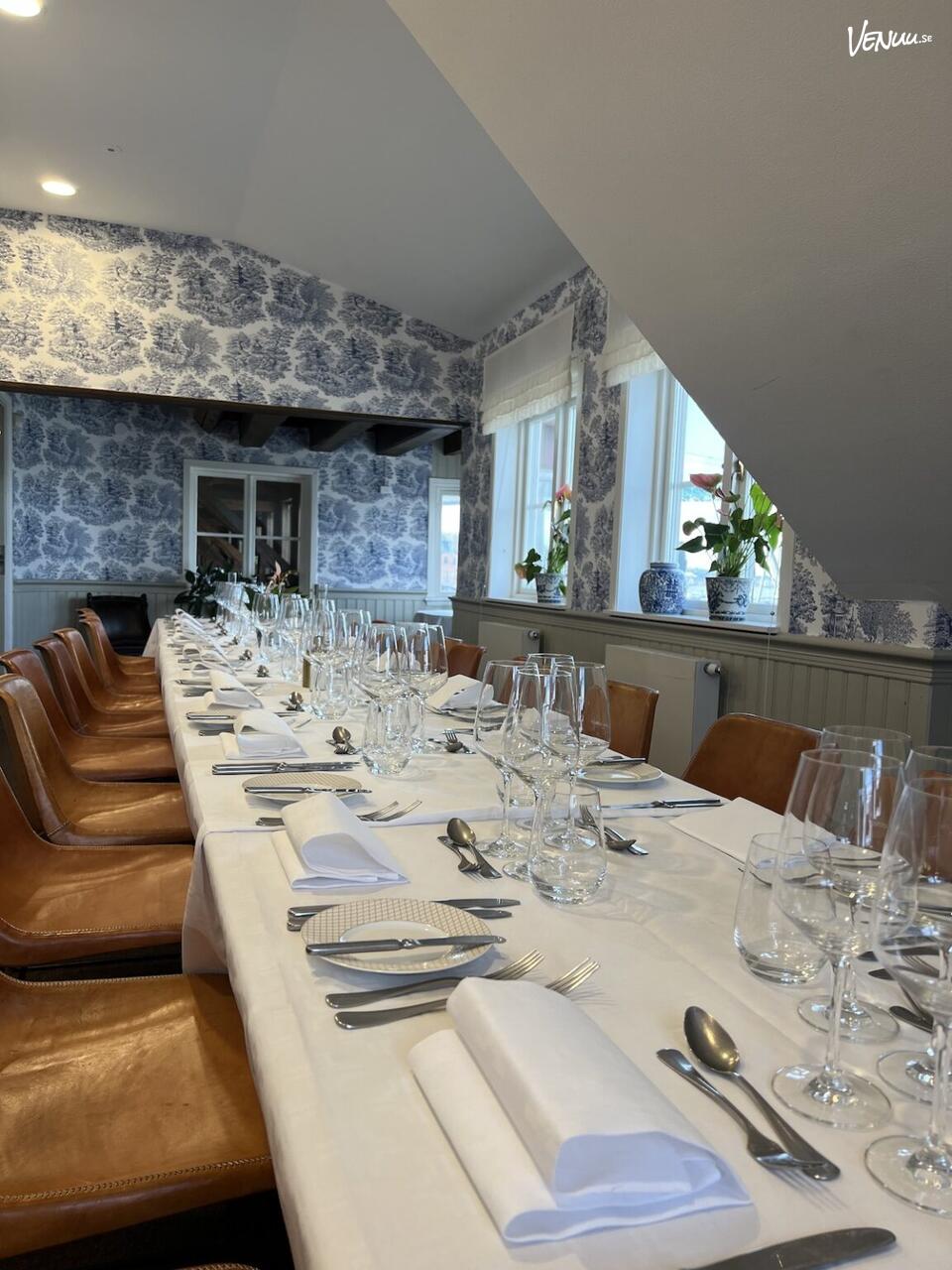 Kapacitet för 18 sittande gäster längst ett långbord.