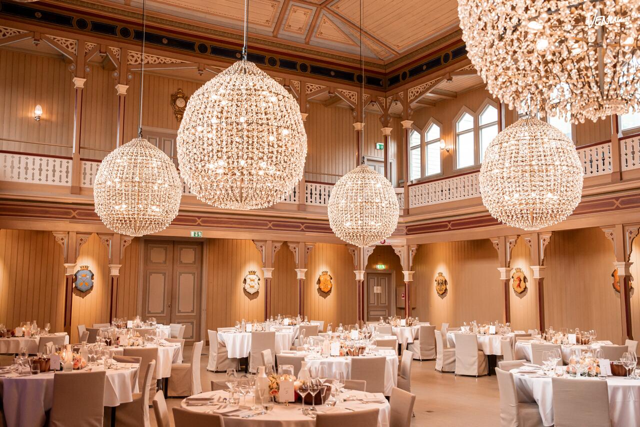 Stora Salen är hjärtat i Societetshuset Marstrand. Ett rum med historia, atmosfär och en närvaro som känns direkt när man kliver in. De höga fönstren släpper in ljuset från havet och kristallkronorna sprider ett mjukt sken över dukade bord och glada gäster. Här finns plats för upp till 250 personer, vilket gör salen perfekt för både bröllop, företagsevent och stora middagar. Det är en plats som bjuder in till firande, men samtidigt känns varm och personlig.