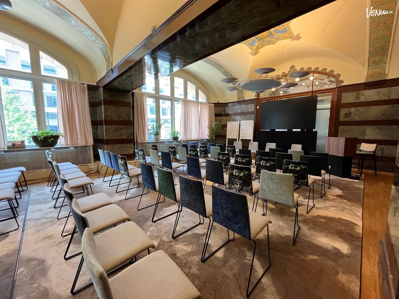 Biblioteket är ett pampigt mötesrum med marmorklädda väggar och trägolv med flexibel möblering. Generöst ljusinsläpp från stora fönster och utsikt mot Vasagatan. Historisk interiör med välvda tak och dekorativa takmålningar. 100" skärm, trådlöst nätverk, whiteboard, blädderblock samt anteckningsmaterial ingår i lokalen.
