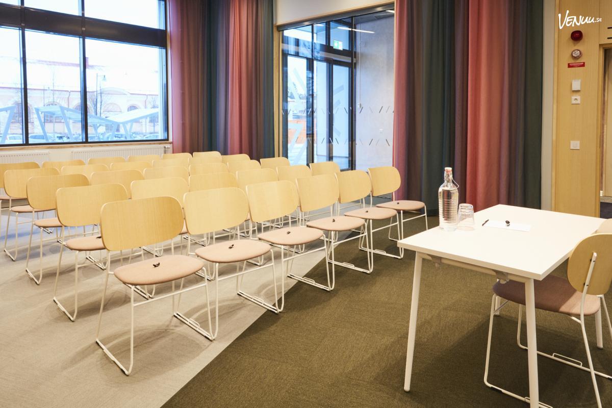 Nr 10 är ett praktiskt och flexibelt mötesrum som lämpar sig väl för mindre konferenser, möten och workshops. Rummet kan möbleras efter olika behov beroende på mötets upplägg och rymmer upp till 24 personer i biosittning, 16 personer i skolsittning och 12 personer i styrelsesittning. Den genomtänkta planlösningen gör rummet lämpligt både för presentationer och mer diskussionsbaserade möten.