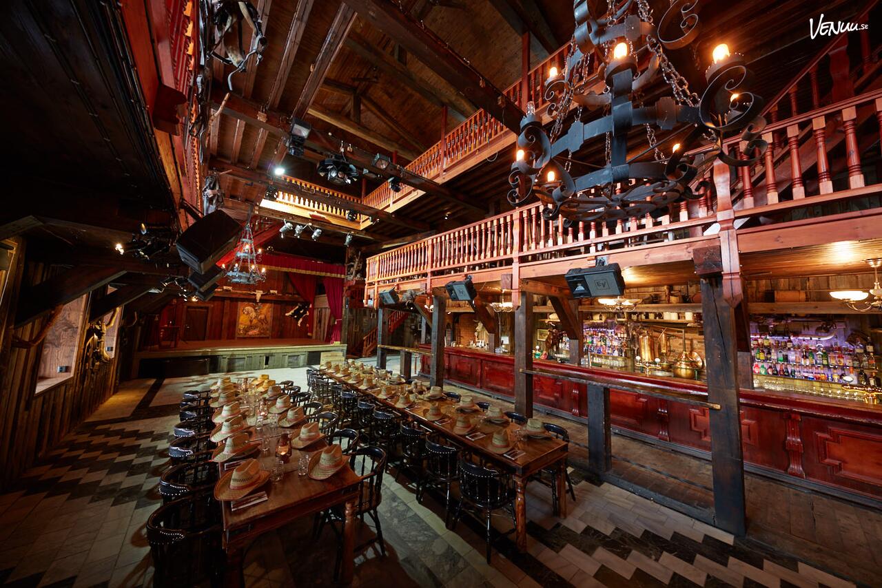 Saloonen består av tre våningar och genomsyras av en autentisk westernkänsla. Denna unika utformning ger ditt event en dynamisk karaktär och möjlighet att nyttja ytorna på olika sätt under kvällen.