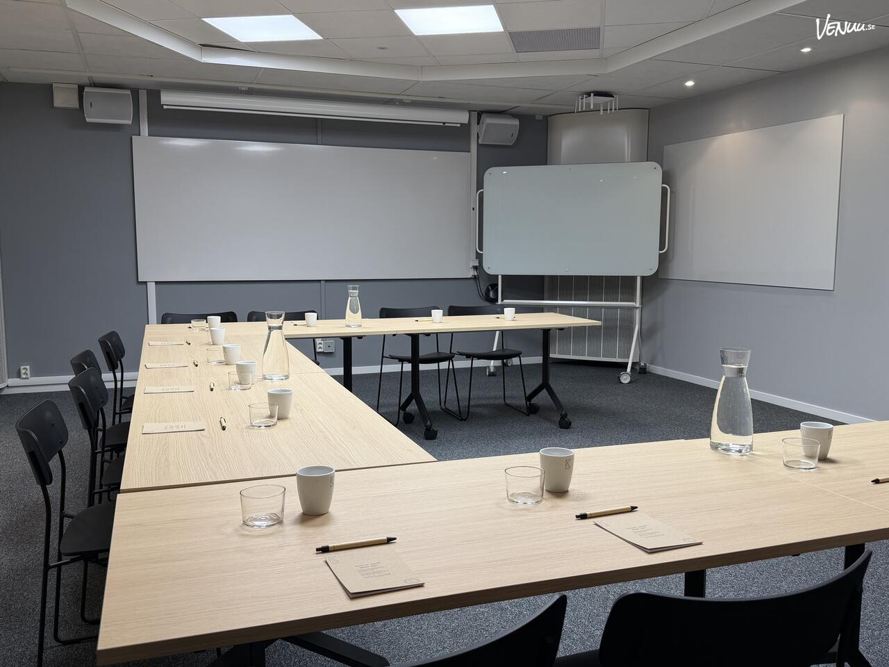 Rummet passar särskilt bra för arbetsmöten i ö-sittning eller U-form, exempelvis planeringsdagar, budgetmöten eller kreativa workshops. Den flexibla möbleringen gör det enkelt att anpassa rummet efter dagens behov och skapa ett effektivt arbetsflöde.