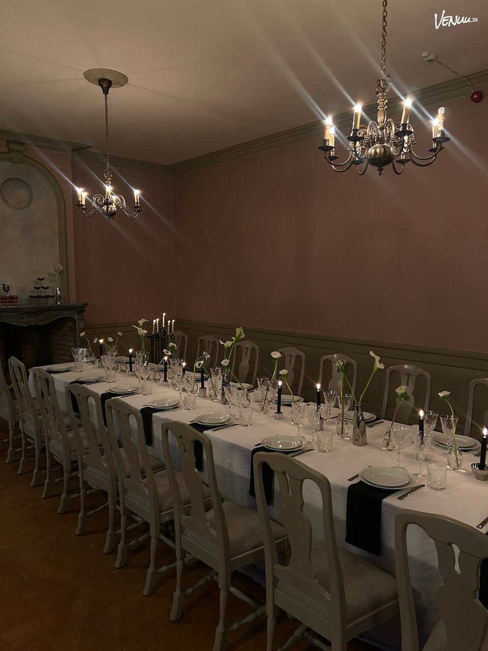 Slottets hjärta är utan tvekan den vackra Rosa Salen. Här möts man av ett fantastiskt ljusinsläpp från de generösa fönstren som blickar ut över den välskötta slottsparken och vattnet. Salen är smyckad med magnifika ljuskronor och en klassisk eldstad som skapar en atmosfär av både lyx och hemtrevnad.